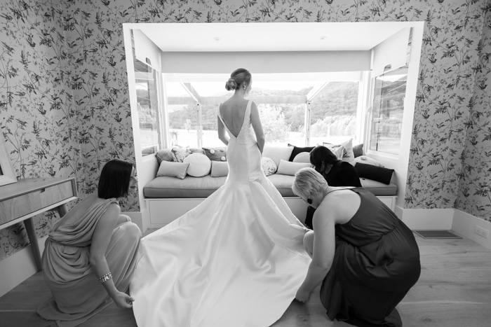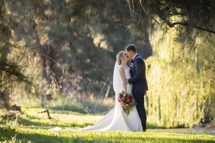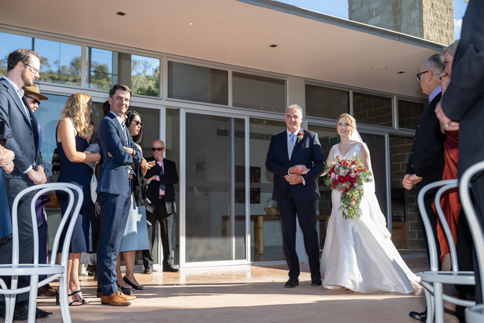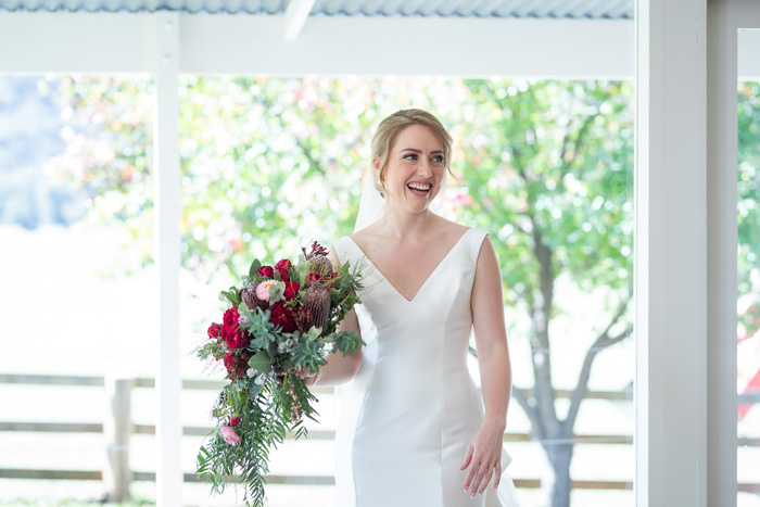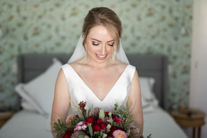 The bride wore a simple fishtail style dress designed by Monique Lhuillier. From the designer’s Bliss Collection, Sarah purchased the dress in London after trying on every style under the sun and eventually finding a dress that made her feel like herself. The gown had a clip-on train that added volume to the skirt, making the bride feel like she was getting two dream dresses in one! Contrasting with her dress, Sarah had a bouquet created using a mix of flowers native to the region, full of banksias, red kangaroo paw, pink strawflowers and red roses to tie it together.