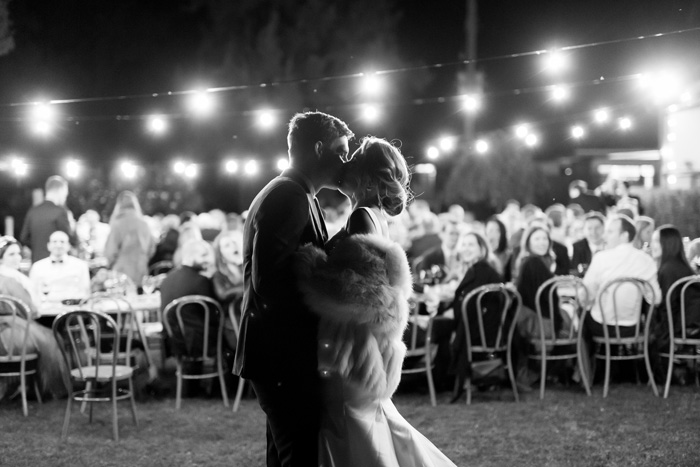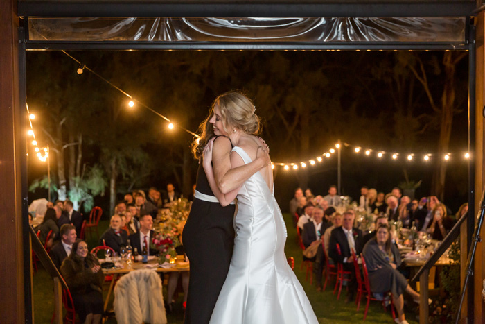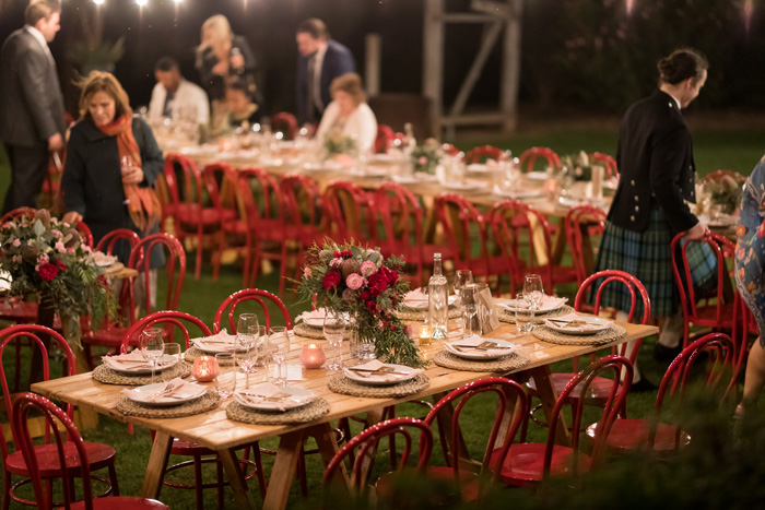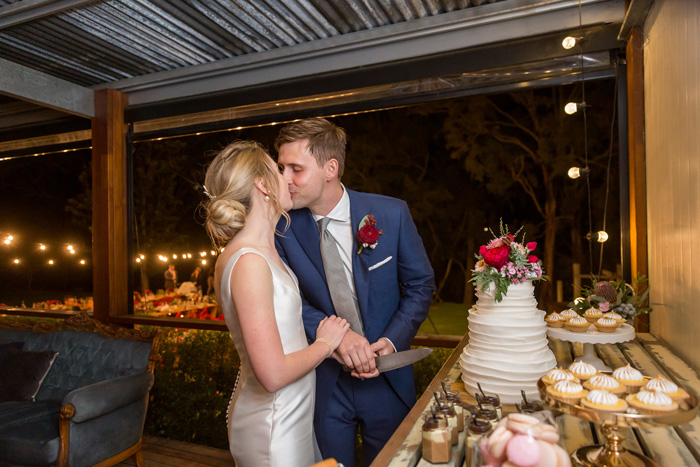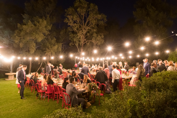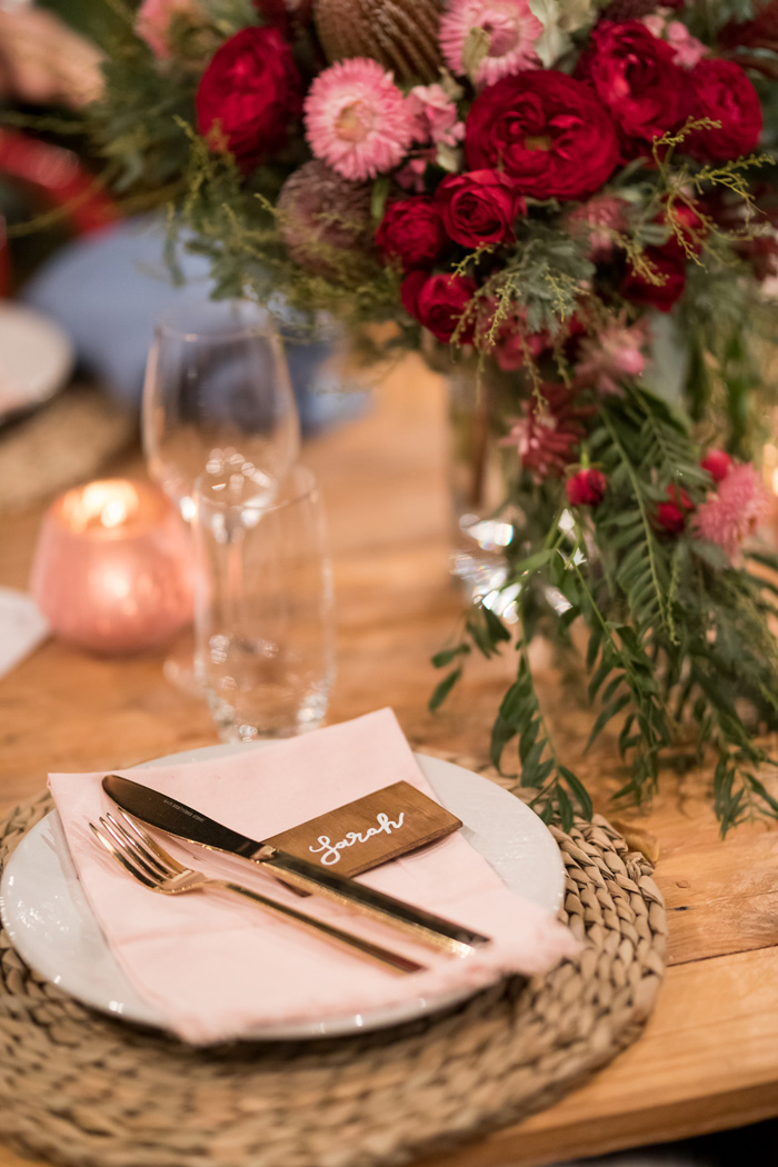 The reception took place at Burnbrae Wines, another winery in Mudgee. The venue was outdoors with covered areas, lit up with delicate fairy lights. The long tables had overhanging floral arrangements that matched the bride’s bouquet, bringing in the native florals to tie the reception decor into the surrounding landscape. The table was set with wooden place settings, offset by white plates, soft pink napkins, and gold cutlery, letting the flowers draw the eye.