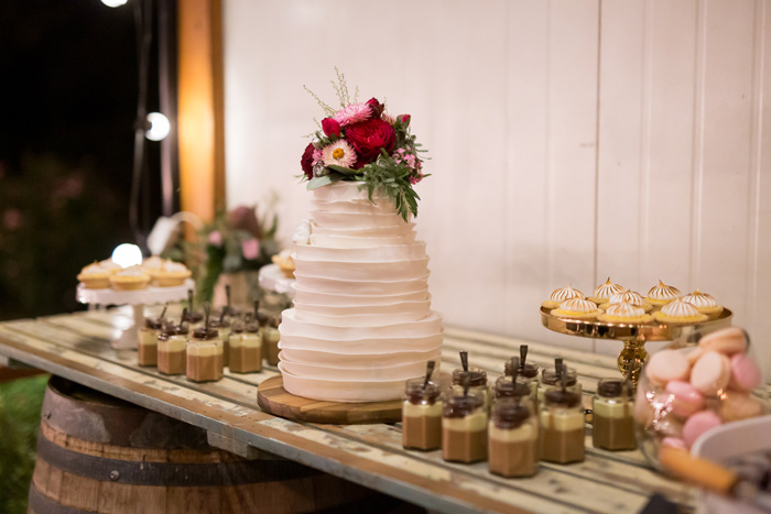 Adding to the relaxed feel of their big day, the couple’s guests were treated to a sit-down meal consisting of delicious share plates. For guests with a sweet tooth, the dessert table was home to the couple’s beautiful wedding cake, as well as an array of delicious treats!