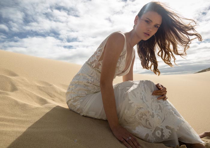 Photography Our Carousel Studios / Hair & Makeup Helen Samaryan using Tom Ford Beauty / Stylist Lauren RK / Art Director Kimberlee Kessler / Model Evie @ Vivien’s / Gowns Brides by Francesca / Fashions by Farina / Q’Nique / Sant Elia / Jewellery All rings by: Sit & Wonder / Sant Elia shots Earrings by Sit & Wonder / Brides by Francesca (1) shots: Necklace by Sit & Wonder / All other jewellery is stylists own.