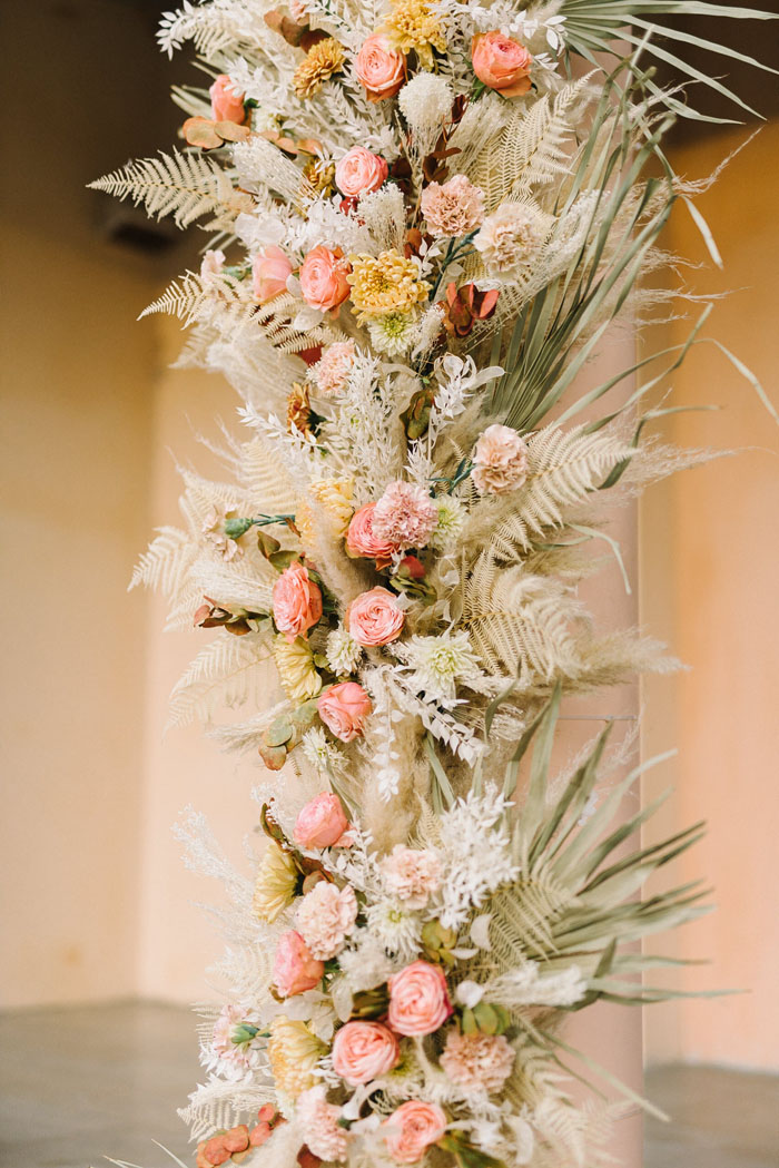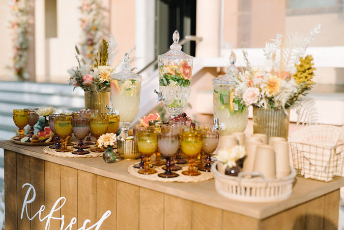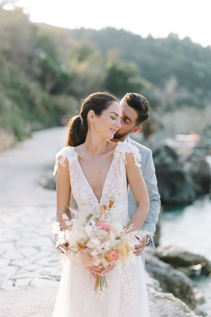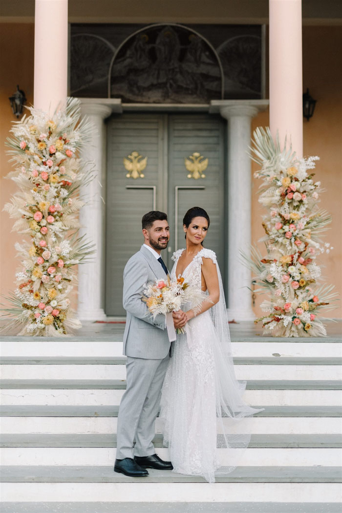 The ceremony took place in a modern Greek church decorated with breathtaking dried florals of neutral hues, matching Sophia’s bouquet. The flowers looked spectacular against the sage green door, white steps, and pink and beige wall. Outside of the church was a table filled with stylish refreshments, gorgeous traditional fans, and more beautiful floral displays. The refreshments were there for the guests to enjoy before partaking in the heartwarming tradition of throwing rice over the newlyweds.