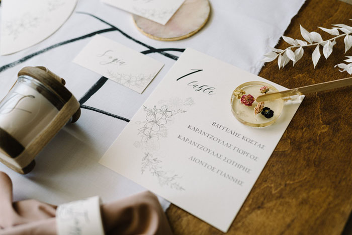 From the onset, Sophia and George desired a modern wedding located near the calming sea, filled with elegant touches and refined details that exuded a heavenly aesthetic. Their stationery suite was a custom creation of a synthesis of sketched flowers with the personal touch of their very own logo. The stationary was a harmonious blend of blanket white letterpress and wax seal, combined with mocha tones and brought to life with dried flowers in a neutral palette.
