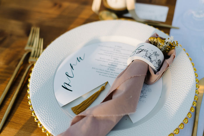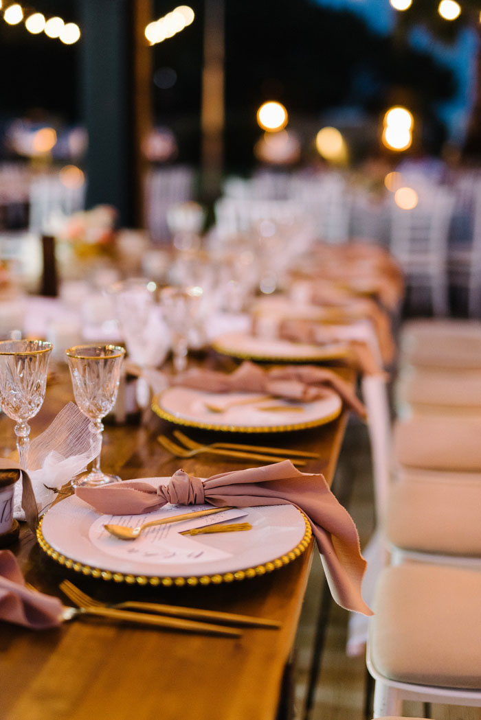 Sophia and George decided to fill their table settings with unique and elegant personal touches. Tables were embellished with graceful handmade details, such as their personal logo hand-painted upon the linen table runners. Wooden hand-painted table numbers and porcelain napkin rings sketched with intricate flowers were also included. The menu cards consisted of fine paper fans, with delicate silk tassels which contributed to the luxurious feel, alongside the gold detailed tableware. The gorgeous table settings gained more of a romantic and stunning sensation by the onset of twinkling lights floating above, providing the feel of a starry night sky.
