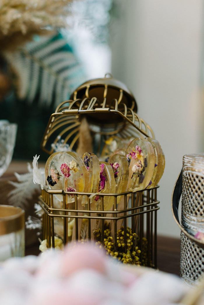 The reception was held at the glorious Mango Beach Bar, looking out towards the white sands and calming sea of Preveza. The beautiful bar was transformed into a breathtaking celebration space that oozed modern-day elegance and tropical desires. When first entering the romantic oasis, friends and family were welcomed with a variety of sweet treats, such as lollipops filled with vibrant flowers and exquisitely handcrafted biscuits tying in with their stationery set. Guests were wowed by the impressive seating board designed with large exotic fans matching with their tropical and luxurious styling.