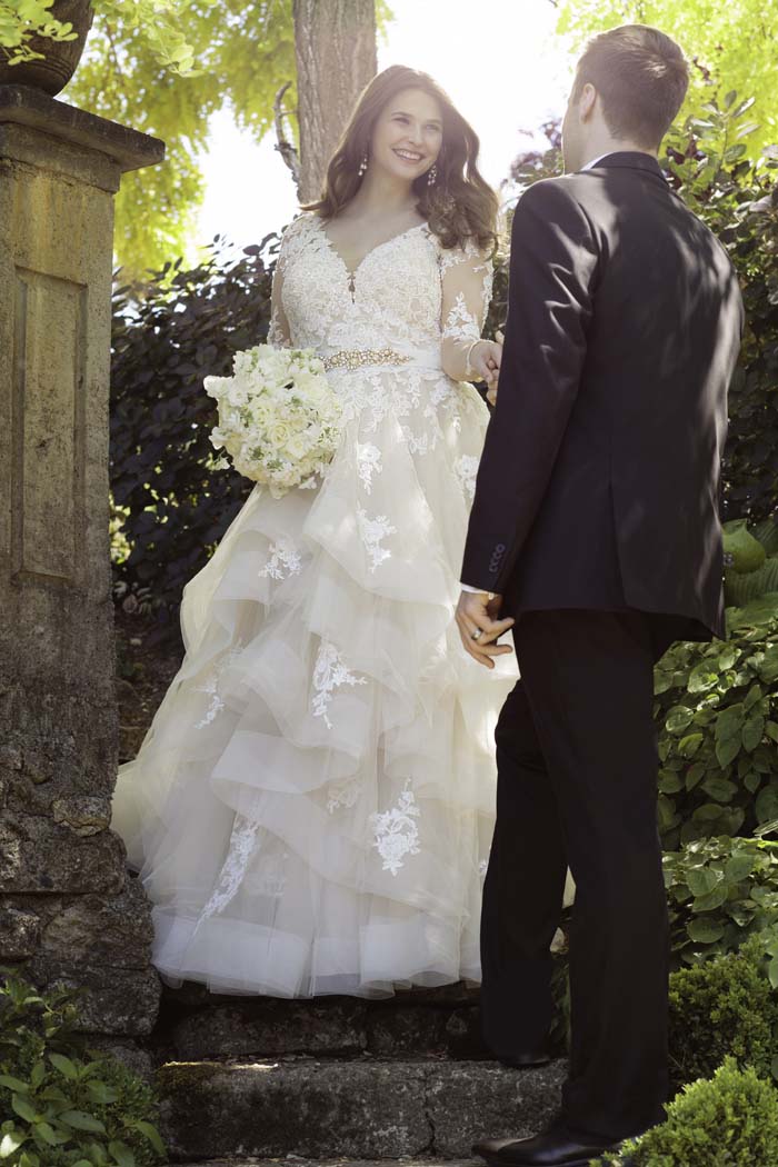 This plus size wedding dress with sleeves from Essense of Australia is as dreamy as it is flirty! Layers upon layers of horsehair hemmed tulle create a skirt that is frothy, fun and figure-flattering. Delicate lace is placed throughout the skirt, adding dimension and distinct drama to this plus size gown.