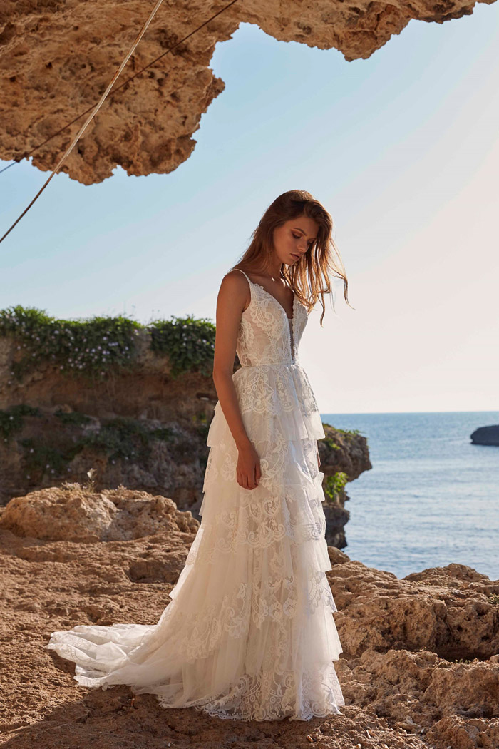 If there is one inevitable for summer, it’s the sun! So why not shine with it? We absolutely love this all-over sequin dress from Berta’s 2020 Napoli collection, which will sparkle from daylight to moonlight. The deep neckline and flowing skirt mean you’ll also have the added bonus of staying cool.