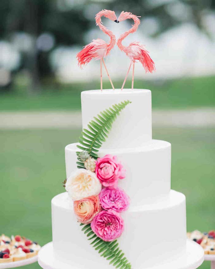 Nothing says summer like a tropical island getaway. To get this feel at your wedding, try a tropical themed wedding cake. Include tropical flowers and colours, or even go for a more plant based decoration and use palm leaves. This is another summer wedding cake design that can be done with real flowers or with fondant decorations.