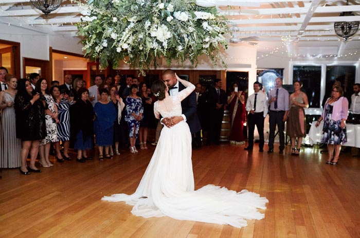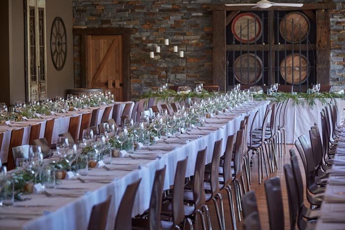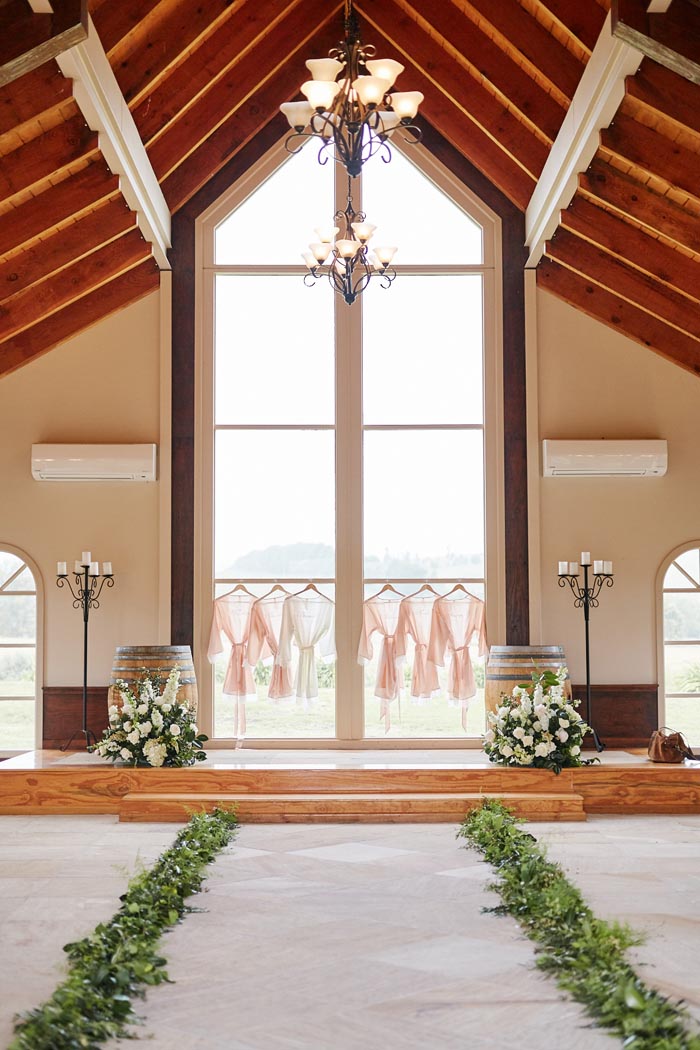 We love the grandeur of the high ceilings and vast, rolling green hills that featured in Bianca and Steve’s real wedding at Immerse. The wine barrels decorated in white floral arrangements and foliage along the ceremony aisle both look so pretty! Captured by White Lane Photography.