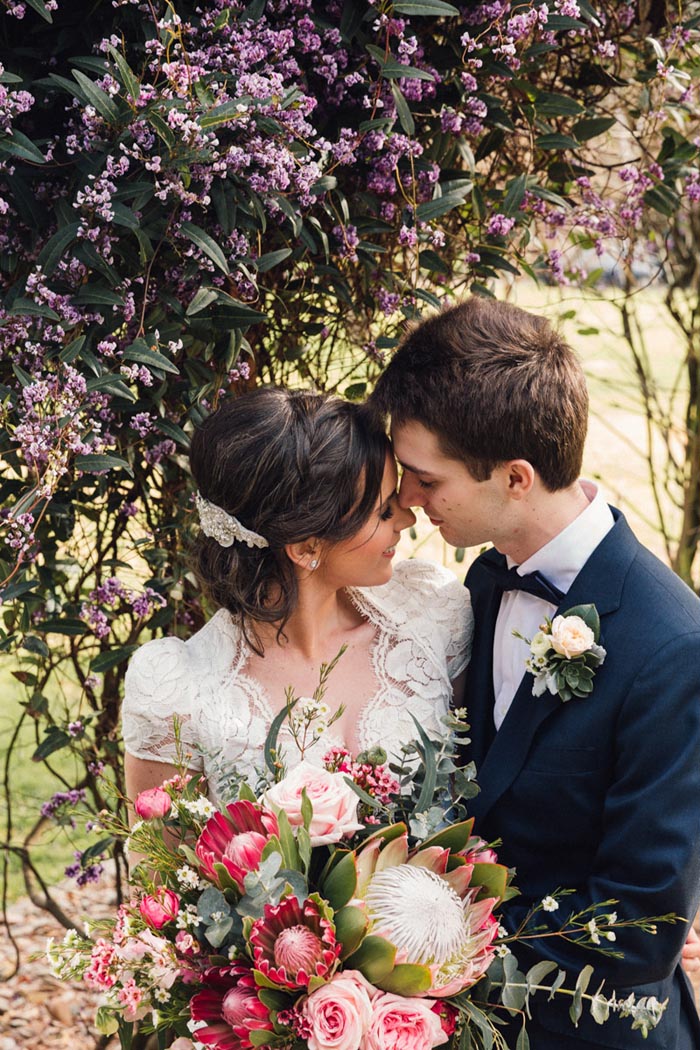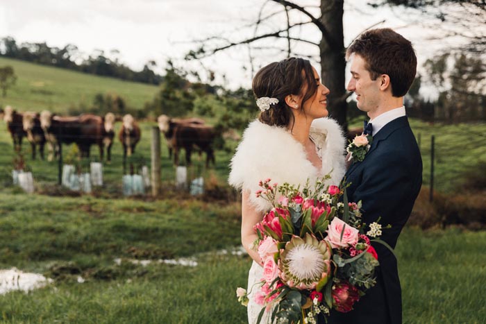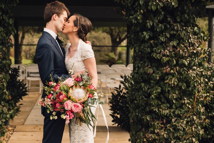 Kelly and Sam’s real wedding at Immerse was filled with classic elegance. Kelly’s vintage lace wedding dress, fur bolero and pink bouquet of proteas and roses all looked beautiful against the elegant gardens and even a few cows! Captured by Georgia Wiggs Photography.