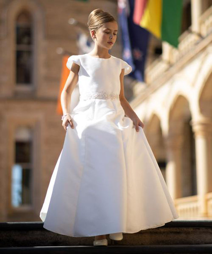 We can’t help but swoon over this stunning white dress paired with a statement silk sash! The corded lace top features pretty capped sleeves and is paired with a silk skirt under a layer of tulle. The perfect princess dress for your flower girl!