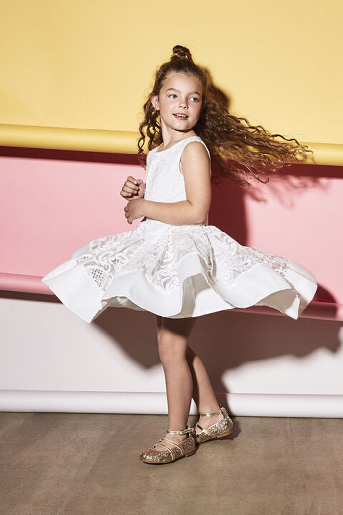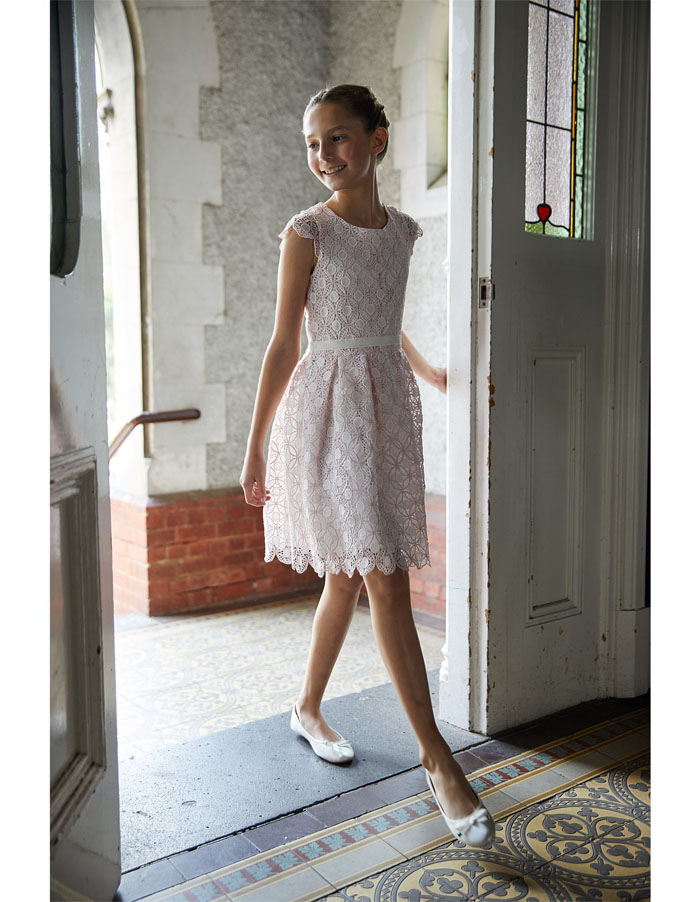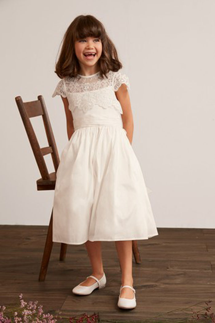 For a look that’s totally chic, opt for this charming two-tone lace dress! With a velvet ribbon bow and a sweet scalloped hem, this sateen-lined frock is super elegant and will make your flower girl feel truly grown up.