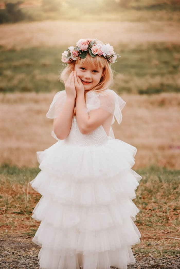 If your little miss is the kind of girl who loves to run around barefoot with flowers in her hair, this is the perfect flower girl dress for her! This whimsical frock features a lovely lace bodice with gorgeous flutter sleeves and a show-stopping full-length tulle skirt for a flower girl look that’s fit for a princess.
