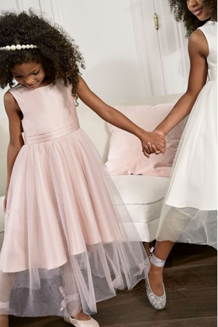 Make your flower girl feel like the belle of the ball in this showstopping gown. With a delicate rounded neckline, elegant front bow detailing and a full pleated skirt, this look is almost too cute for this world!