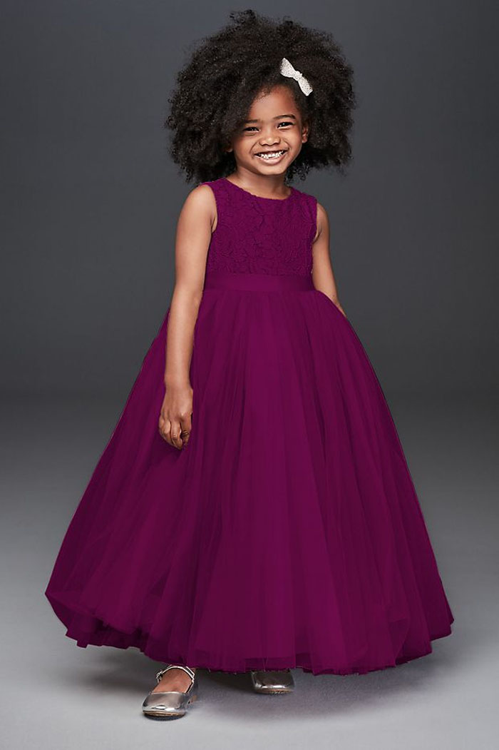 If you’re looking for flower girl dresses that are as pretty as a petal, look no further than this super sweet gown! This adorable dress features lots of lace, a touch of tulle, plenty of pearls, and a flurry of floral patterns. What more could a flower girl want?