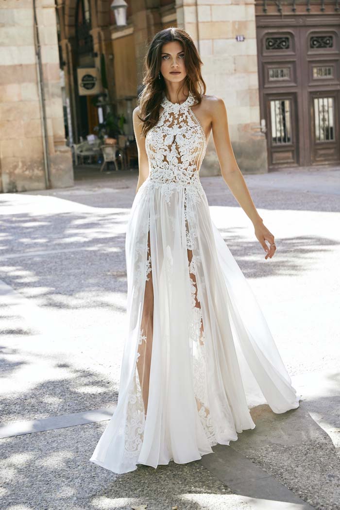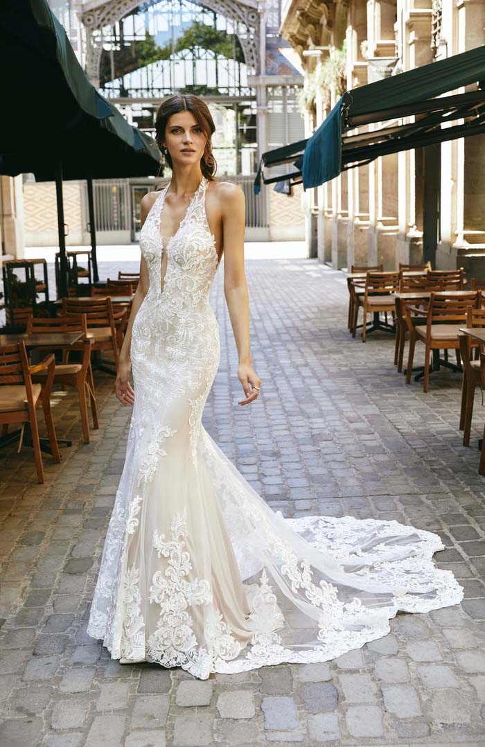 Coachella meets bridal? This daring, sheer halter lace wedding dress has the most outstanding open back detail and makes a truly breathtaking statement. The perfect dress for the ultimate boho babe! This beauty has a serious destination/dessert wedding vibe…it also gives us Kendall Jenner wedding vibes!