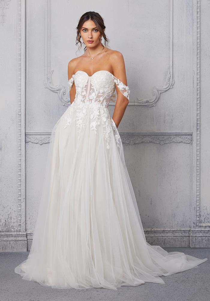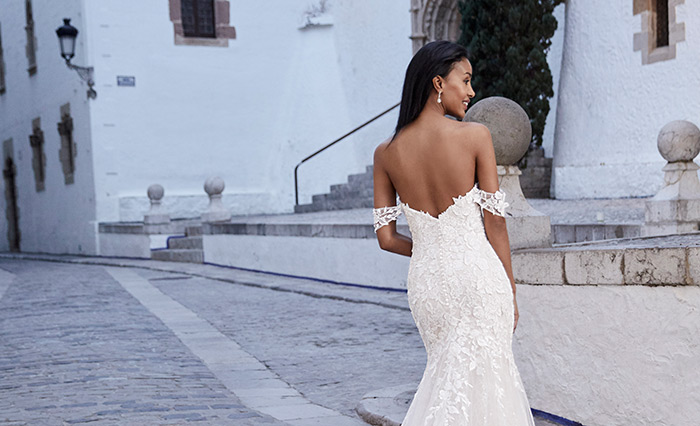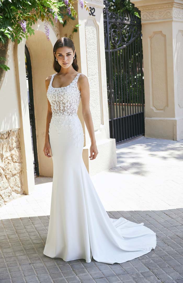 Exaggerated sculptural blooms and show-stopping 3D floral appliqué are certainly taking over the bridal world in 2022! This Ronald Joyce gown provides such a fresh design to a classic fit. The contrasting plain skirt and floral bodice with open lace appliqué are beautifully completed with stunning bridal buttons cascading down the dress to the hemline. Just gorgeous!