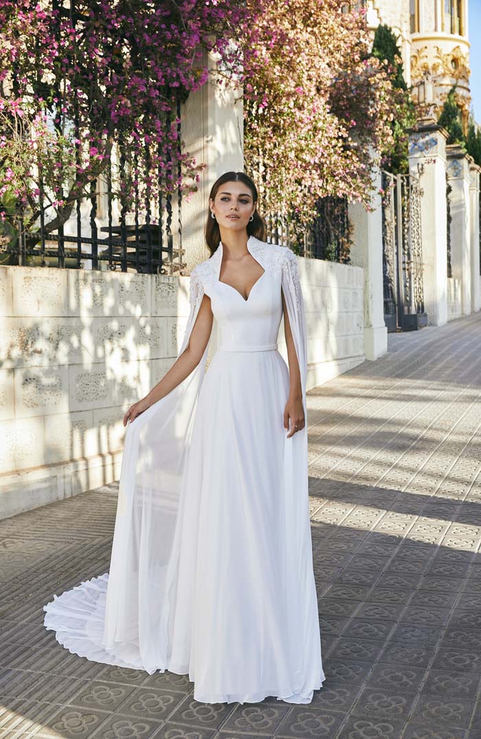 This gown is fit for a royal! This classic style has been elevated with a striking back profile thanks to the delicately beaded Queen Anne collar and regal cape. The half diamond neckline accentuates the décolletage and delivers a gorgeous, feminine silhouette. This beautiful design is completed with a simple waistband and bridal button detailing – just gorgeous!