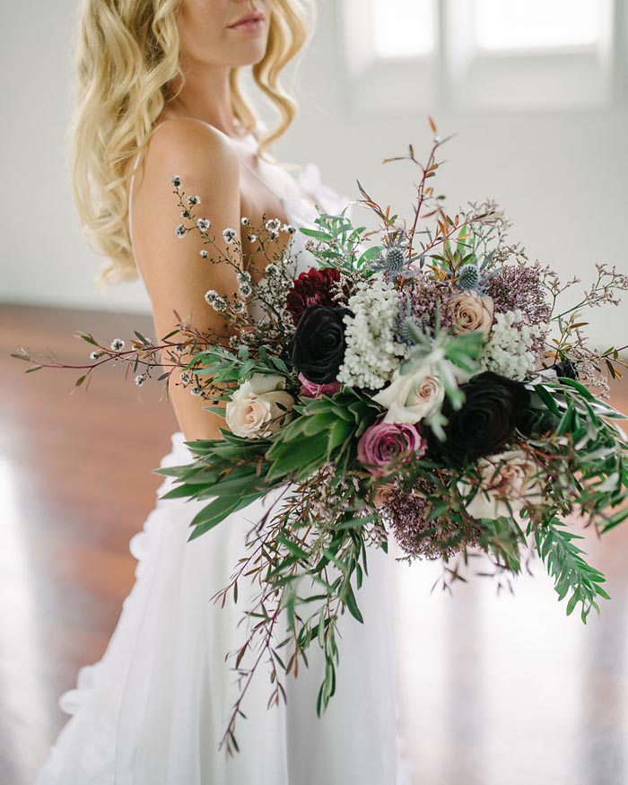 The simple, paired-back styling by Renee Green Creative and hire from Avideas will transport you to a place of beauty, tranquillity and romance. Foliage and vases of varied roses, sea holly and baby’s breath surround a plush chaise lounge and Persian runner. The blooms are the handiwork of Kate Dawes Flower Design who has also created a bridal bouquet using deep purple and green hues.