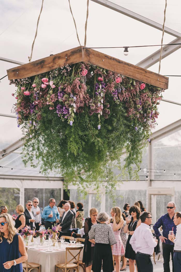 To add a bit of rustic charm to your garden wedding, look no further than a flower chandelier. The flowers are typically arranged on a pre-made structure. This can be made out of a variety of materials. Incorporating timber or metal can make your flowers pop more, creating an art installation rather than simply a wedding decoration.