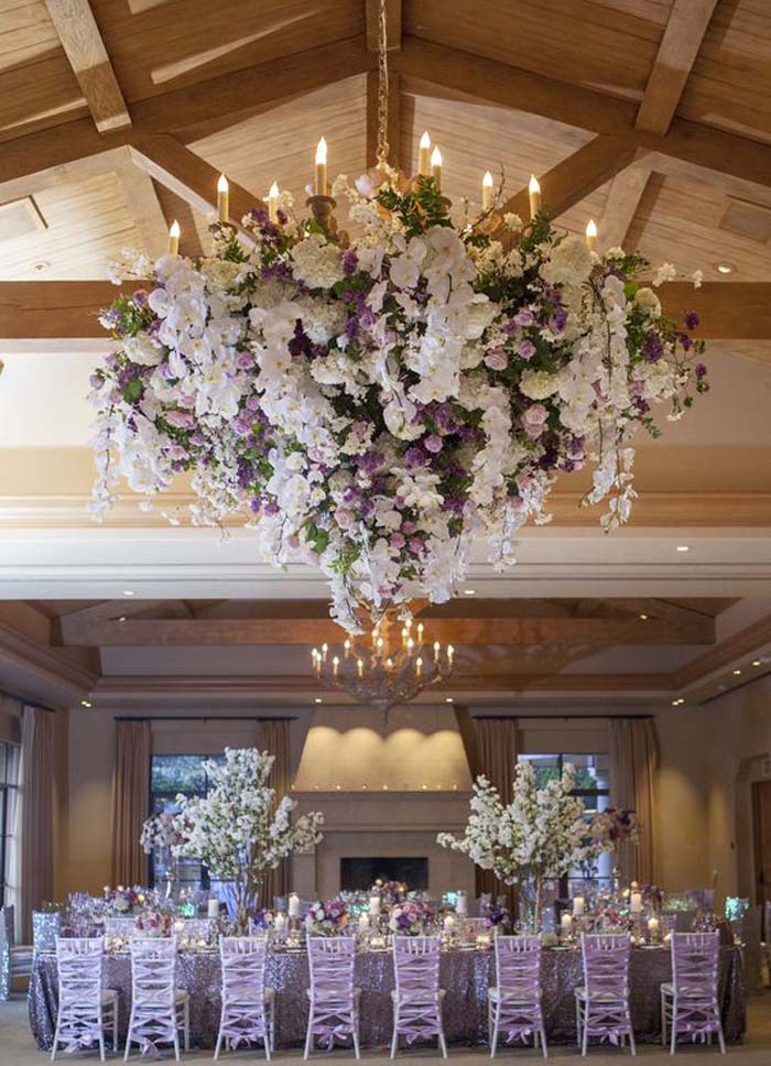 To add a unique twist to your flower chandelier, consider having some of your flowers cascading down. Flowers that are prone to a cascading shape, such as orchids, create cohesion between your chandelier and centrepieces.