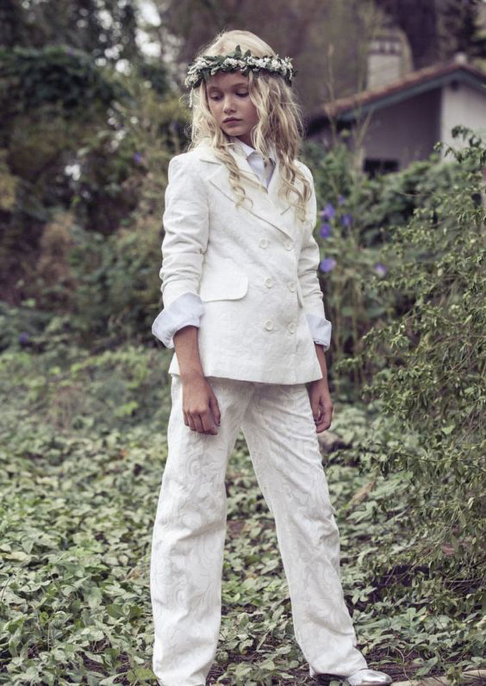We are completely obsessed with this chic ivory suit! The textured fabric is totally eye-catching and the whole look has a smart and sophisticated feel that we L-O-V-E. This style is perfect for the flower girl who can’t stand skirts but still wants to be dressed to the nines on the big day.