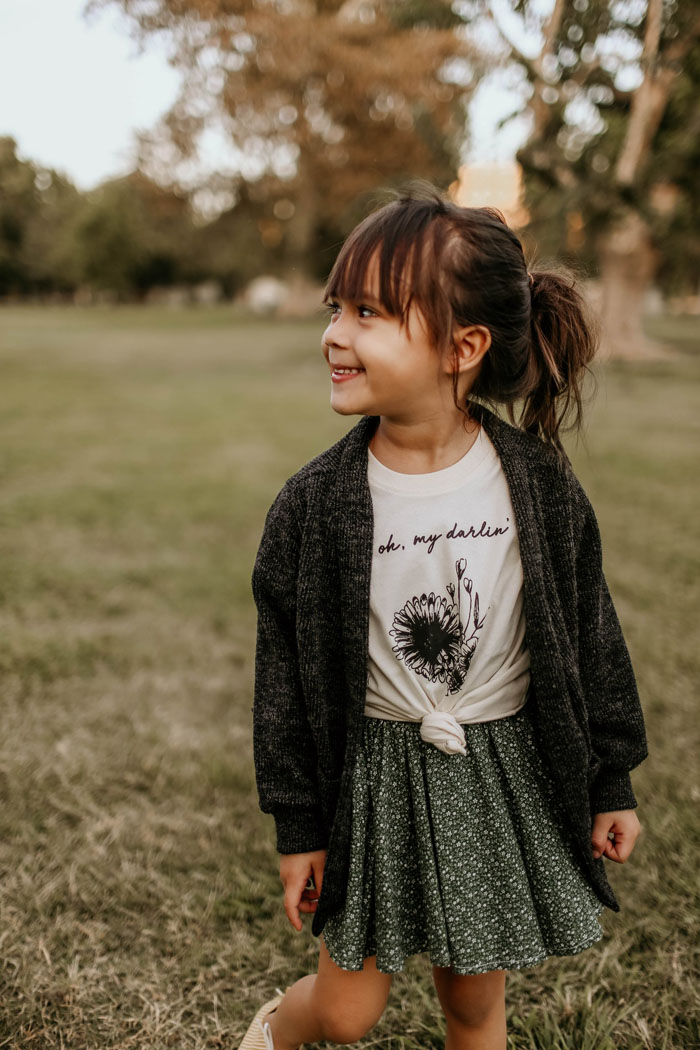 If you’re a laidback bride who’s opting for a casual ceremony, keep your flower girl feeling comfortable in this adorable floral-inspired look. The outfit features a flower print that acts as a nod to your little lady’s wedding duties while the sweet and simple skirt and cardigan pairing keep the look super relaxed.