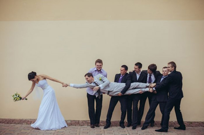 Once you’re married, his friend’s may be scared of losing the groom to you forever. Poke fun at this assumption by pulling your man away from his party!