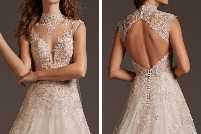 When we think of wedded winter warmth, a striking high neck or sophisticated collar calls to mind. For brides seeking an air of sophistication, take your gown up a notch, and opt for a higher neckline. Simple but a statement, this feature will not only offer some extra warmth, but will emphasise height and your striking architecture, allowing you to tastefully flaunt more skin elsewhere.