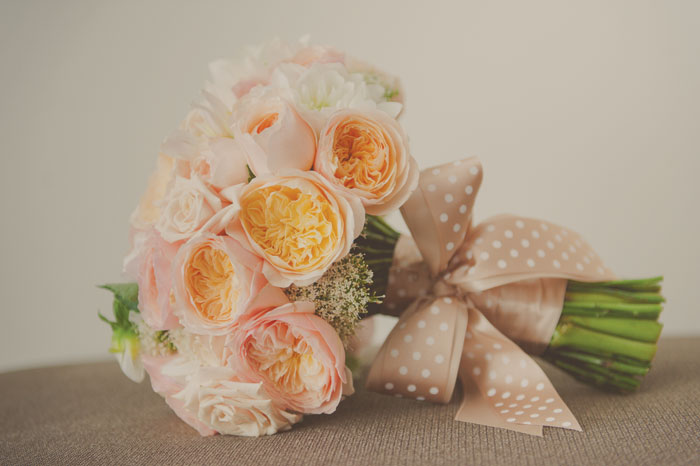 My bouquet was all peach toned with David Austins, Dahlias and full opening roses. My bridesmaids had unstructured Sahara rose {peachy/beige tone} posies to match their shoes. Our bouquets were bound in beige/white polka dot ribbon with big bows.