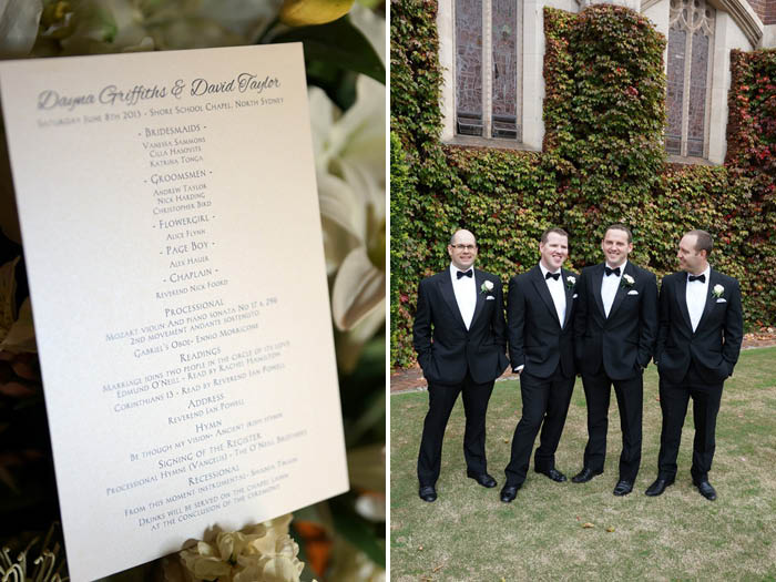 Photography Bradley Patrick of SugarLove Weddings Ceremony Venue Shore Chapel Reception Venue The Bathers’ Pavilion Bride’s Gown Pronovias Bridal Headpiece and Cuff Anna Campbell Bridal Cape Marisol Aparicio Veil Melinda Rose Bridesmaids’ Dresses Bridesmaids Only Hair Roula Zafiris of Gorgeous Hair Crows Nest Makeup Isabella Schimid Groom’s Attire Peppers Flowers David Jones/Poho Flowers Cake Faye Cahill Stationery WillowLane Studios