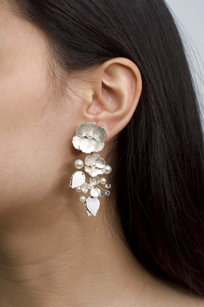 Aurelia by Eternal Bridal create the most perfect delicate statement for any blushing bride. The small clusters of metal flowers droop in a hanging-flower effect and are then decorated with dainty flower sprigs. These earrings are available in either silver and rose-gold and are complete with pearlescent-finishing for a softening effect. Each pair are carefully handmade and will differ in appearance slightly, meaning each earring is unique to you and your wedding. Such a special touch!