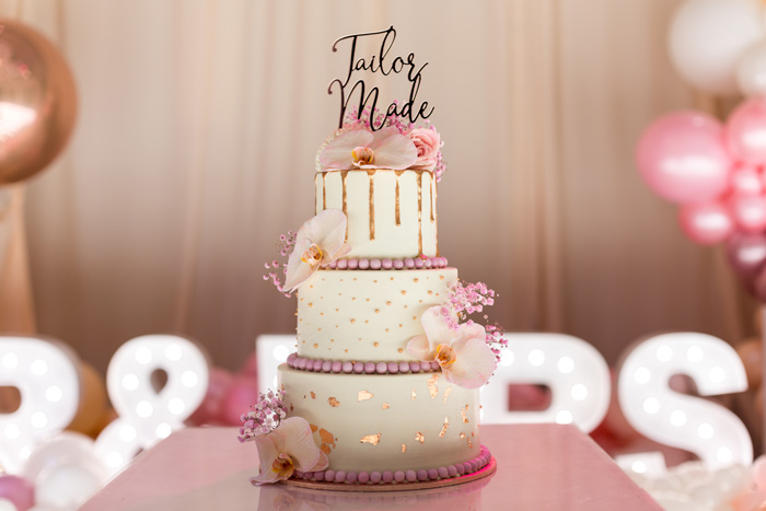 Dessert was not part of the couple’s sit-down dinner but their smash cake and dessert bar was a huge crowd pleaser! Surprising Cam with personalised cricket bats from Personalised Favours, his love for the sport shined as they both took aim at the masterpiece from Smashed Piñata Cakes. The couples “Mr and Mrs M” lights by Lime Light Letters were beautifully framed by the balloon installation from Balloon Essentials, creating a gorgeous backdrop for their pink velvet cake table by The Treasure Room. Across at the dessert bar, guests were spoilt for choice between delicious rose gold and pink cupcakes by Moreish Cakes, as well as personalised cookies from The Cookie Stories Co. with the couples names and wedding date.
