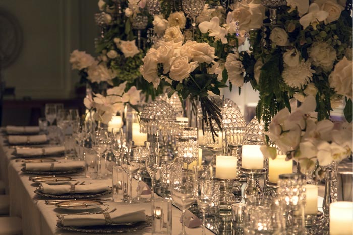 “We love opulence, and our lust for “more is more” was definitely satisfied here, with mirrored runners crowded with candle holders and crystals all reflecting flickering light.”